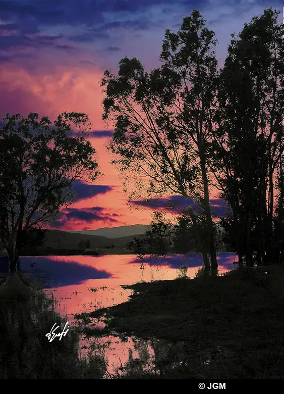 La superficie de un embalse, un horizonte bajo y algunas nubes, cercanas al punto del ocaso, hicieron posible esta apacible puesta de sol. Un primer plano la hubiera cambiado sustancialmente, pero no lo había.